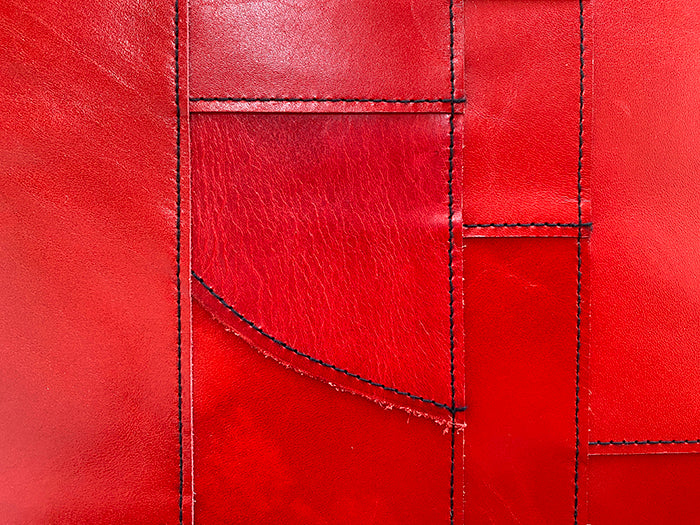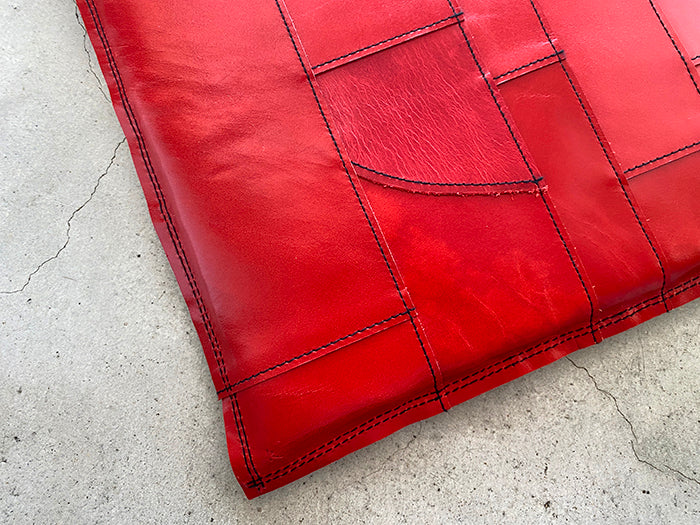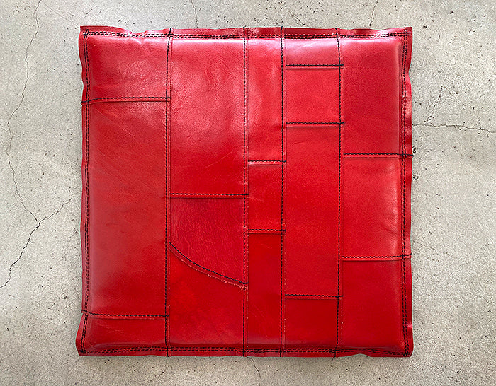 手帳やウォレットなどに使っている牛革を、座布団やクッション用に1mmの厚さに漉き、一枚一枚手仕事でカット。表情の違う革を繋ぎわせて一点ものの製品が完成します。